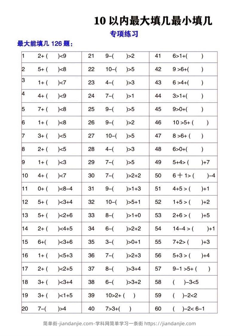 18 3+( )<3+4 38 6-( )>3t2 | 58 ( )-3<5 19 3+( )<1+5 39 10>2+( ) 59 “ ( )-2<2 Po_ 7-( _)>4 40 7>3+H( ) 60 ( )-2<6-1 简单街-jiandanjie.com-学科网简单学习一条街 https://jiandanjie.com