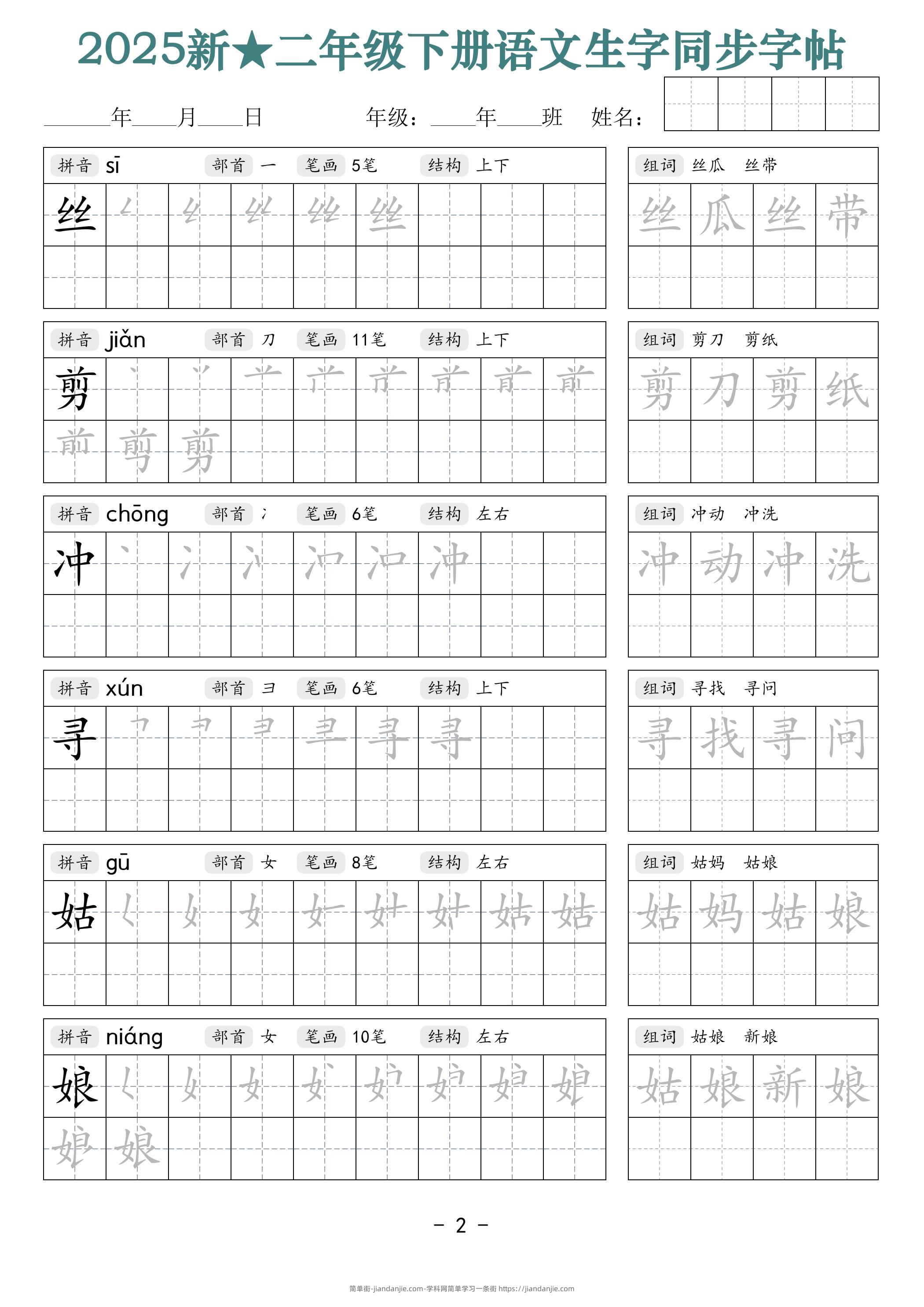 25新二下语文生字同步字帖(笔顺组词42页)拼音部首笔画结构 简单街 1年前发布 关注 私信 020 25新二下语文生字同步字帖(笔顺组词42页)拼音部首笔画结构此内容为付费资源,请付费后查看¥1.2黄金会员免费钻石会员免费立即购买您当前未登录!建议登陆后购买,可保存购买订单格式pdf页数42 页大小4.59 MB付费资源 ——预览已结束,还剩40页未读——开通会员后可免费下载高清完整文档 © 版权声明文章版权归作者所有,未经允许请勿转载。THE END小学语文喜欢就支持一下吧点赞0 分享收藏0