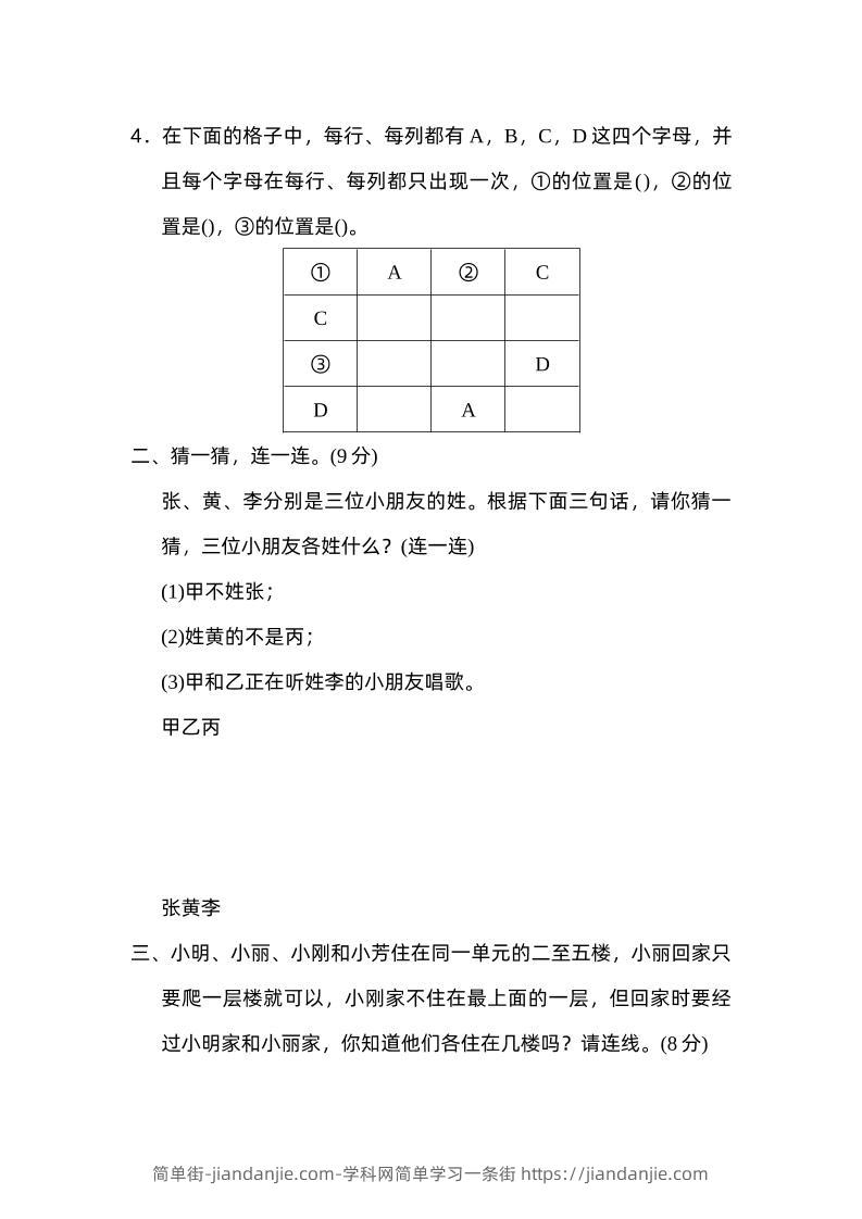 4. 在下面的格子中,每行、每列都有A,B,C,D 这四个字母,并