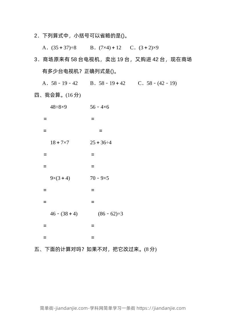 3. 添上括号后可以改变混合运算的运算顺序。0)
