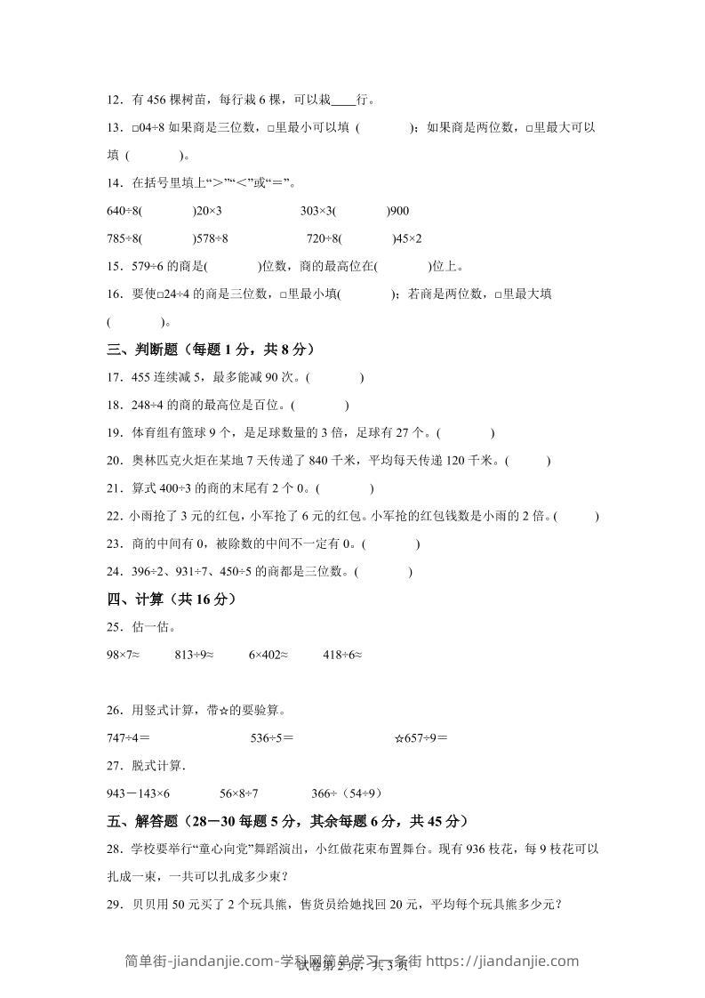 14、在括号里填上”> “<<"或"="。 40:8( JP0x3 303x3( )900 785s8( )578<8 720:8( )45x2 15, 579*6 的商是( )位数,商的最高位在( )位上。 16、 要使24*4 的商是三位数,口里最小填( ); 车商是两位数,口里最大填 ( )。 判断题〈每题 1分,共8分) 17. 455 连续碱 5,最多能减 90 次。( 18. 248*4 的商的最高位是百位。( ) 19. 体育组有篮球 9 个,是足球数量的 3 倍,足球有27 个。( ) 20.,奥林丐克火炬在其地 7 天传递了 840 千米,平均每天传递 120 千米。( ) 21. 算式 400*3 的商的末尾有2个0。( 划 22. 小雨抢了 3 元的红包, 小军抢了 6 元的红包。 小军抢的红包钱数是小雨的2 倍。 ( ) 。商的中间有 0,被除数的中间不一定有0。( ) 24. 396=2、93137、450-5 的商都是三位数。( ) 四、计算(共16分) 25. 佑一估。 98x7= 81349- 6x402= 41846= 26. 用坚式计算,带六的要验算。 747*4= 5365一 太657:9一 27,脱式计算, 943一143x6 S6x8i7 3668 (349) 五、解答题 〈28一30 每题 5 分,其余每古6分,共45分) 28. 学校要举行“童心向党"舞蹈演出,小红做花束布置舞台。现有 936 枝花,每9 枝花可以 扎成一划,一共可以扎成多少束? 29. 贝贝用 50 元买了 2 个玩具能,售货员给她找回 20 元,平均每个玩具能多少元? ndanjie.com -学秋歼得弟尝习5s条街 https://jiandanjie.com