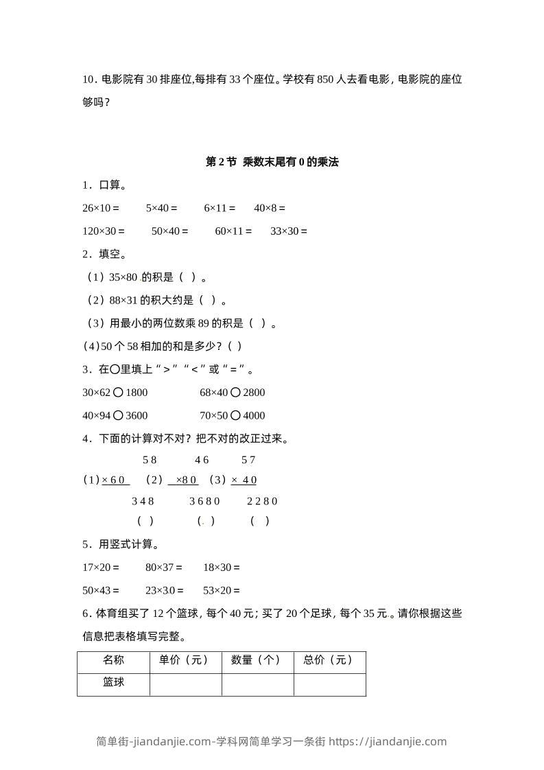 3. 在O里填上“>“ “< "或"="。 30x62 O 1800 68x40〇2800 40x94 〇3600 70x50 〇 4000 4下面的计算对不对? 把不对的改正过来。 58 46 到 (Dx60 。 (2) _x80 (3) x 40 348 3680 2280 () C) (0) 5,用坚式计算。 17x20= 80x37= 18x30= 50x43 = 23x30= 53x20= 6. 体育组买了 12 个篮球, 每个40 元; 买了 20 个足球, 每个 35 元.。请你根据这些 信息把表格填写完整。 名称 单价 (元) | 数量 (个) | 总价 (元) 篮球 简单街-jiandanjie.com-学科网简单学习一条街 https://jiandanjie.com