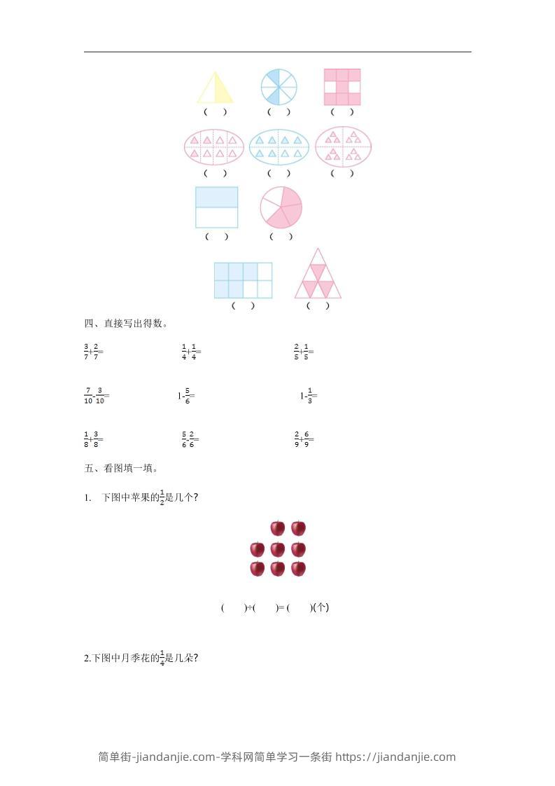 1.10 个苹果,平均分成 5 份,取其中的 3 份,用分数表示就是