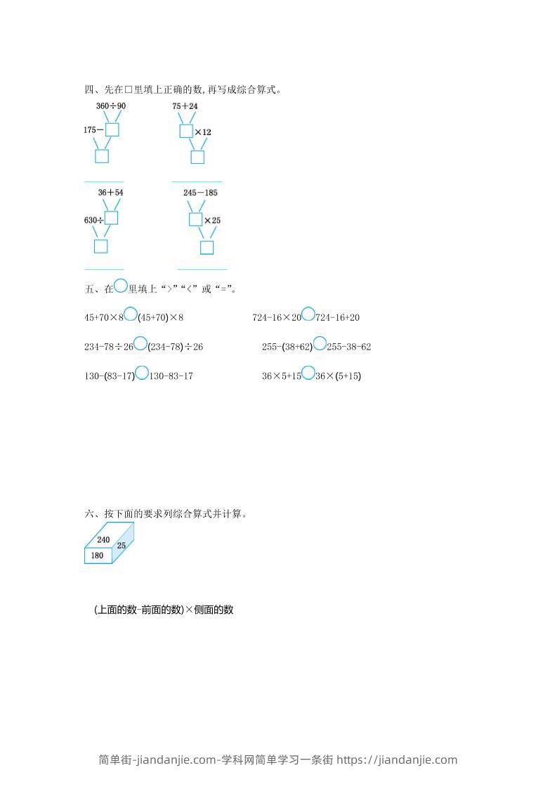 五、 在里泣E “3w “en 或<" 15470XBCJd5t70)XB 72-16x20C7af-ita0 231-78:26C〇(234-78):26 255-(38+62)C)255-38-62 130-B3-ITJCJ1a0-83-17 36x65+15C)36Xx 5415) 六、按下面的要求列综合算式并计算。 细内 180 (上面的数 -前面的数)x例面的数 ndanjie.com -学科网简单学习一条街 https://jiandanjie.com