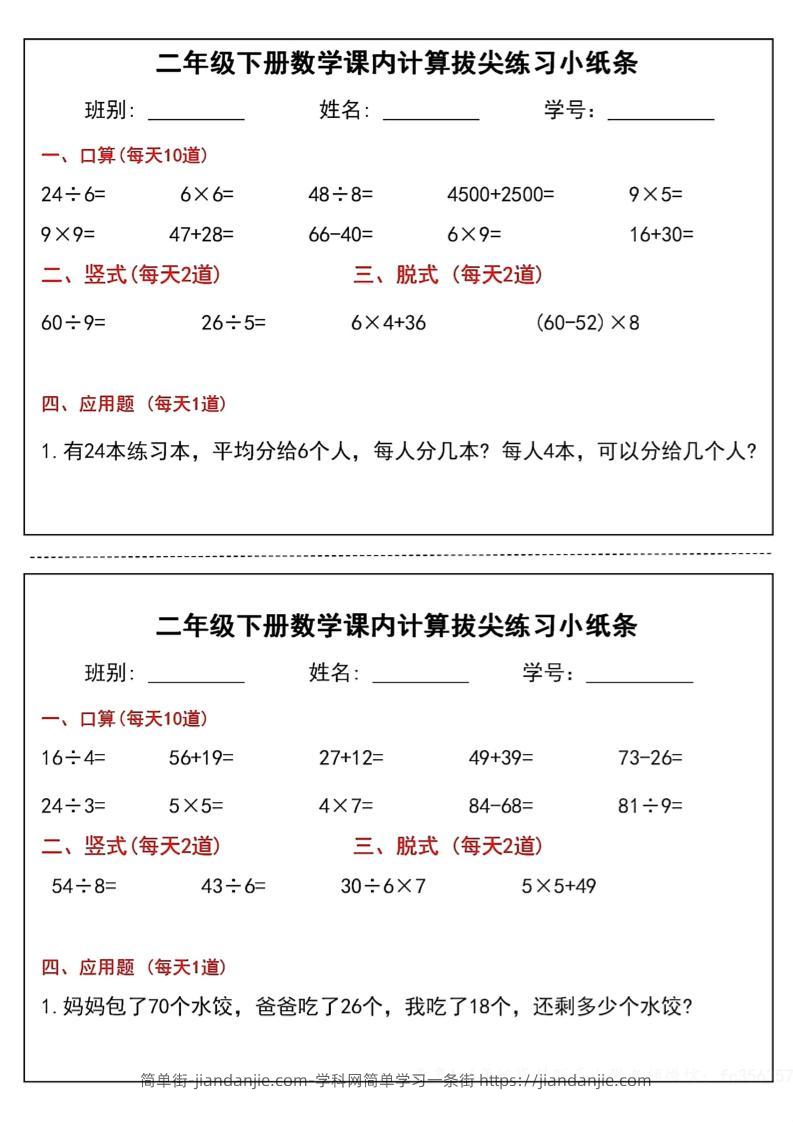 二下数学课内计算拔尖练习小纸条(15页30条)-高清无水印完整版本 简单街 1年前发布 关注 私信 020 二下数学课内计算拔尖练习小纸条(15页30条)-高清无水印完整版本此内容为付费资源,请付费后查看¥0.9黄金会员免费钻石会员免费立即购买您当前未登录!建议登陆后购买,可保存购买订单格式pdf页数15 页大小15.45 MB付费资源 ——预览已结束,还剩13页未读——开通会员后可免费下载高清完整文档 © 版权声明文章版权归作者所有,未经允许请勿转载。THE END小学数学喜欢就支持一下吧点赞0 分享收藏0