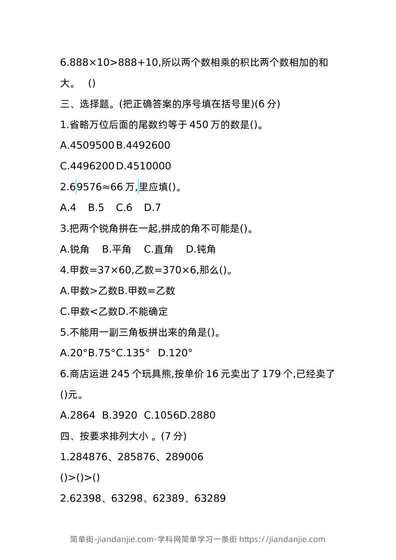 C.甲数<乙数D.不能确定 5,不能用一副三角板拼出来的角是()。 A.20*B.75。C.135。 D.120" 6.商店运进 245 个玩具能,按单价 16 元卖出了 179 个,已经卖了 ()元。 A.2864 B.3920 C.1056D.2880 四、按要求排列大小 。(7 分) 1.284876、285876、289006 (0)>(O>()