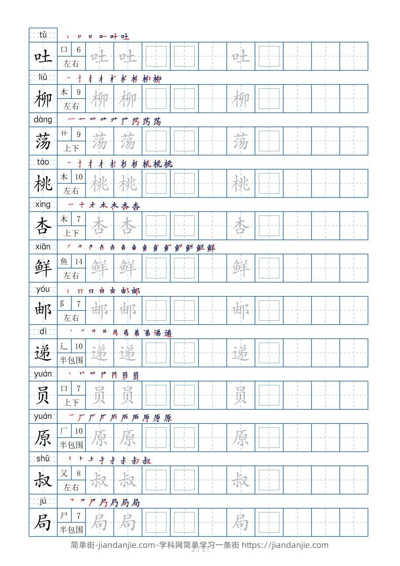 【字帖】二下语文生字表【字帖】250个21页(偏旁部首笔顺拼音)