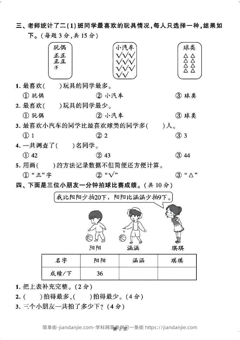 三、老师统计了二(1) 班同学最喜欢的玩具情况,每人只选择一种,结果如