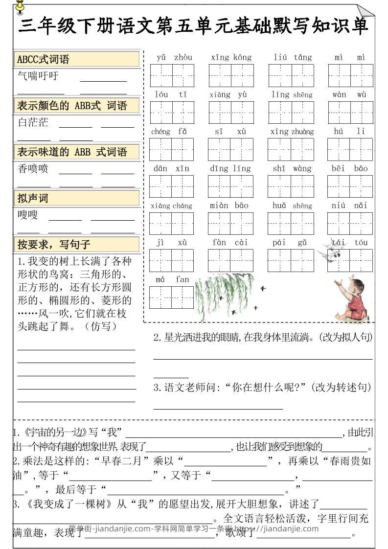 三年级下册语文第五单元基础默写知识单|