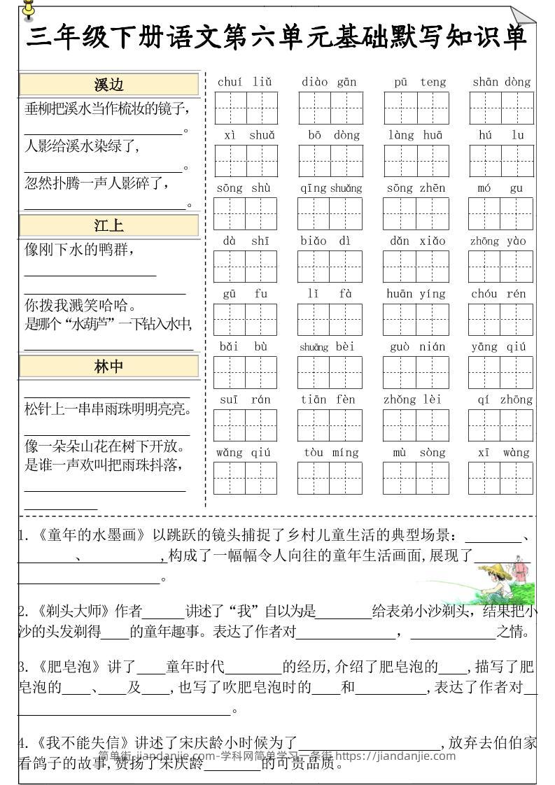 三年级下册语文第六单元基础默写知识单