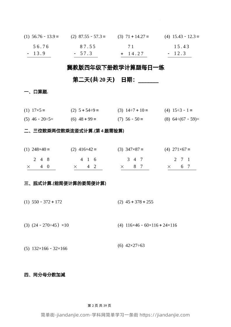 冀教四下数学-计算题每日一练(共20天)(专项练习) 简单街 9月前发布 关注 私信 020 冀教四下数学-计算题每日一练(共20天)(专项练习)此内容为付费资源,请付费后查看¥1.5黄金会员免费钻石会员免费立即购买您当前未登录!建议登陆后购买,可保存购买订单格式docx页数39 页大小704.32 KB付费资源 ——预览已结束,还剩37页未读——开通会员后可免费下载高清完整文档 © 版权声明文章版权归作者所有,未经允许请勿转载。THE END小学数学喜欢就支持一下吧点赞0 分享收藏0