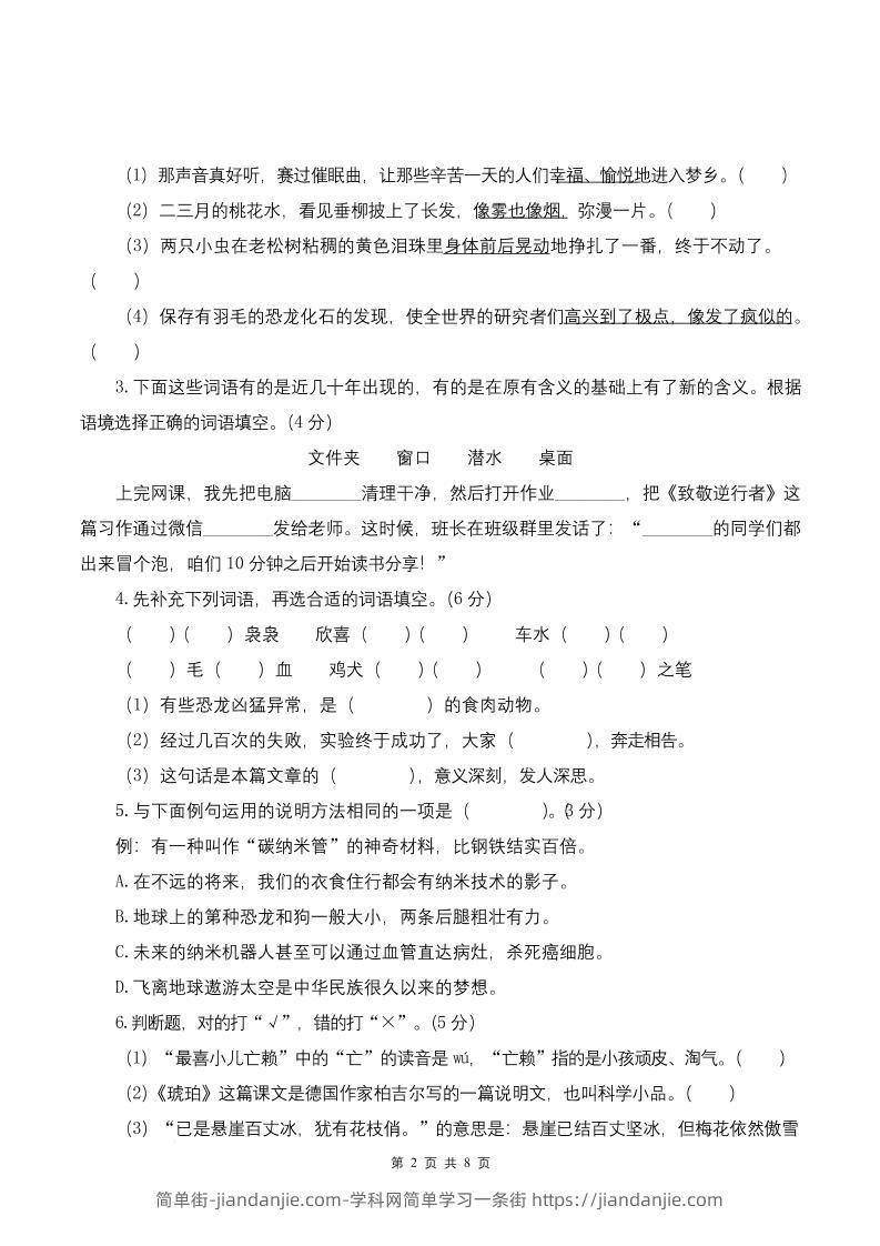 四下语文第一次月考(第一二单元)(考试版A4) 简单街 12月前发布 关注 私信 030 四下语文第一次月考(第一二单元)(考试版A4)此内容为付费资源,请付费后查看¥2.7黄金会员免费钻石会员免费立即购买您当前未登录!建议登陆后购买,可保存购买订单格式pdf页数8 页大小1.07 MB付费资源 ——预览已结束,还剩6页未读——开通会员后可免费下载高清完整文档 © 版权声明文章版权归作者所有,未经允许请勿转载。THE END小学语文喜欢就支持一下吧点赞0 分享收藏0