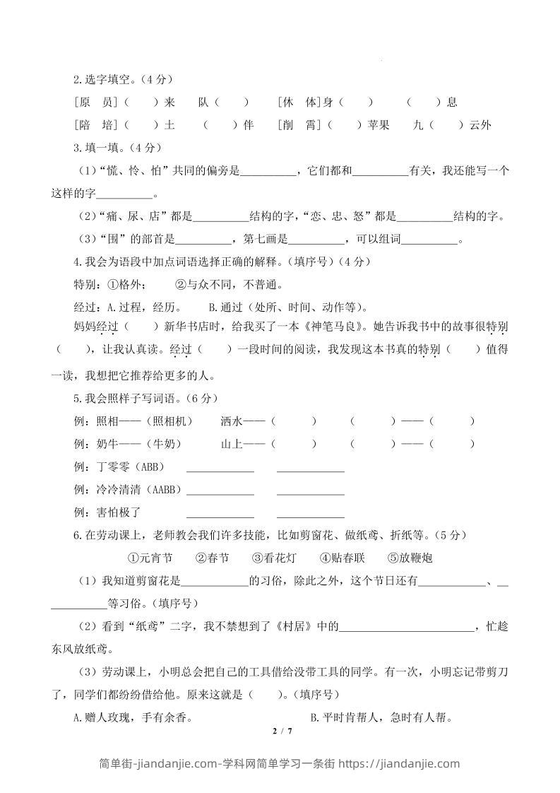 6. 在劳动课上,老师教会我们许多技能,比如剪窗花、做纸芝、折纸等。(5 分