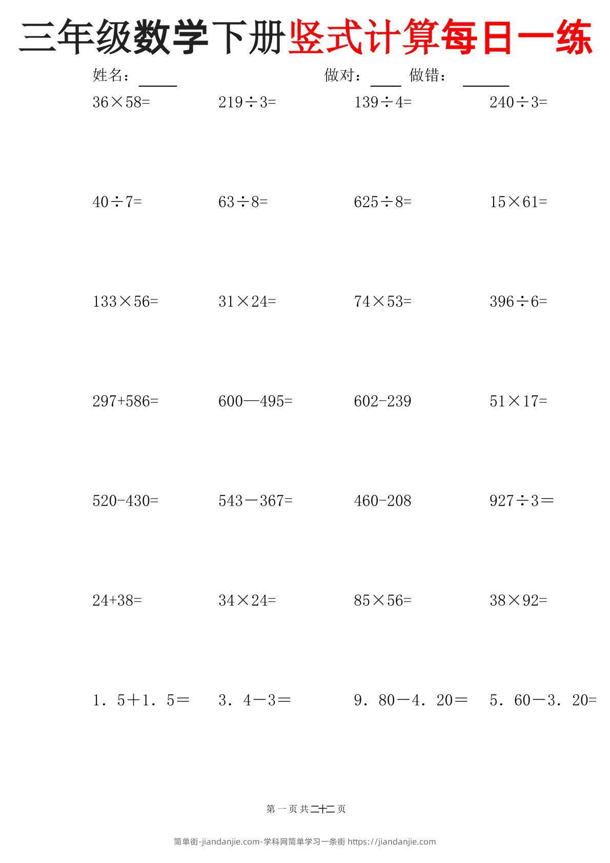 三下数学竖式计算每日一练-pdf三下数学竖式计算每日一练