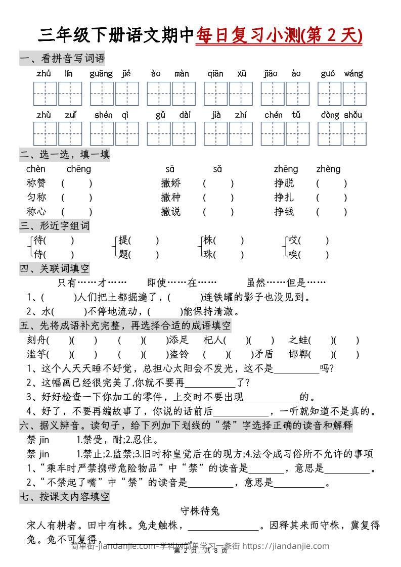 三下语文期中每日复习小测(含答案8页) 简单街 9月前发布 关注 私信 040 三下语文期中每日复习小测(含答案8页)此内容为付费资源,请付费后查看¥0.9黄金会员免费钻石会员免费立即购买您当前未登录!建议登陆后购买,可保存购买订单格式pdf页数8 页大小441.52 KB付费资源 ——预览已结束,还剩6页未读——开通会员后可免费下载高清完整文档 © 版权声明文章版权归作者所有,未经允许请勿转载。THE END小学语文喜欢就支持一下吧点赞0 分享收藏0