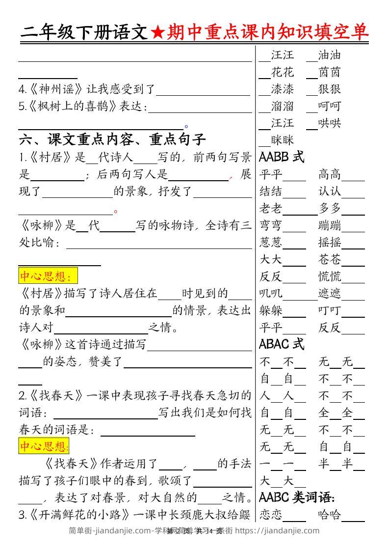 二下语文期中重点课内知识填空单(含答案14页) 简单街 12月前发布 关注 私信 020 二下语文期中重点课内知识填空单(含答案14页)此内容为付费资源,请付费后查看¥1.2黄金会员免费钻石会员免费立即购买您当前未登录!建议登陆后购买,可保存购买订单格式pdf页数14 页大小9.05 MB付费资源 ——预览已结束,还剩12页未读——开通会员后可免费下载高清完整文档 © 版权声明文章版权归作者所有,未经允许请勿转载。THE END小学语文喜欢就支持一下吧点赞0 分享收藏0