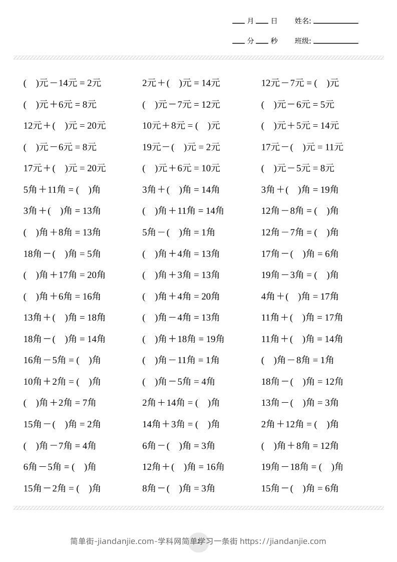 一年级下册数学元角分计算专项练习1000题 简单街 8月前发布 关注 私信 000 一年级下册数学元角分计算专项练习1000题此内容为付费资源,请付费后查看¥1.2黄金会员免费钻石会员免费立即购买您当前未登录!建议登陆后购买,可保存购买订单格式pdf页数17 页大小758.25 KB付费资源 ——预览已结束,还剩15页未读——开通会员后可免费下载高清完整文档 © 版权声明文章版权归作者所有,未经允许请勿转载。THE END小学数学喜欢就支持一下吧点赞0 分享收藏0