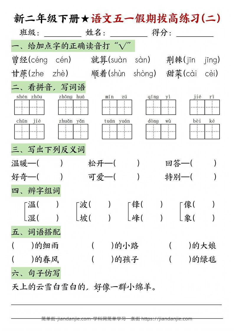 新二年级下册语文五一假期拔高练习 简单街 11月前发布 关注 私信 020 新二年级下册语文五一假期拔高练习此内容为付费资源,请付费后查看¥2.7黄金会员免费钻石会员免费立即购买您当前未登录!建议登陆后购买,可保存购买订单格式pdf页数5 页大小1.88 MB付费资源 ——预览已结束,还剩3页未读——开通会员后可免费下载高清完整文档 © 版权声明文章版权归作者所有,未经允许请勿转载。THE END小学语文喜欢就支持一下吧点赞0 分享收藏0