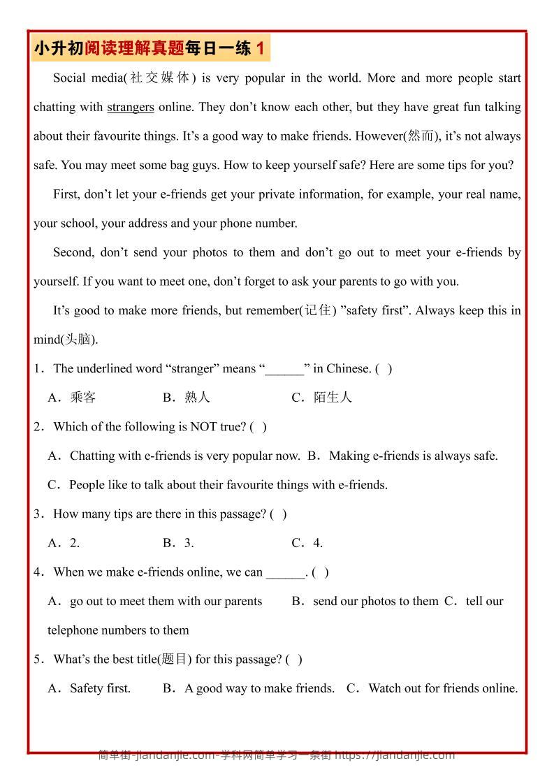 小升初英语阅读理解真题每日一练45题 简单街 8月前发布 关注 私信 010 小升初英语阅读理解真题每日一练45题此内容为付费资源,请付费后查看¥2.7黄金会员免费钻石会员免费立即购买您当前未登录!建议登陆后购买,可保存购买订单格式pdf页数81 页大小1.24 MB付费资源 ——预览已结束,还剩79页未读——开通会员后可免费下载高清完整文档 © 版权声明文章版权归作者所有,未经允许请勿转载。THE END小升初喜欢就支持一下吧点赞0 分享收藏0