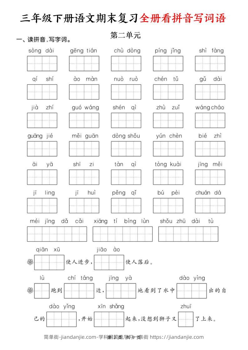 三下语文期末复习全册看拼音写词语(含答案9页) 简单街 11月前发布 关注 私信 030 三下语文期末复习全册看拼音写词语(含答案9页)此内容为付费资源,请付费后查看¥1.5黄金会员免费钻石会员免费立即购买您当前未登录!建议登陆后购买,可保存购买订单格式pdf页数9 页大小5.12 MB付费资源 ——预览已结束,还剩7页未读——开通会员后可免费下载高清完整文档 © 版权声明文章版权归作者所有,未经允许请勿转载。THE END小学语文喜欢就支持一下吧点赞0 分享收藏0
