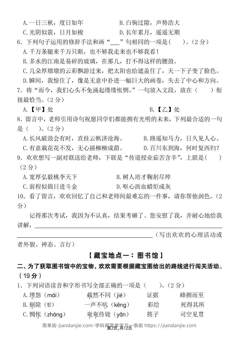 【期末毕业试卷情境题自测卷(含答案)】六下语文 简单街 10月前发布 关注 私信 050 【期末毕业试卷情境题自测卷(含答案)】六下语文此内容为付费资源,请付费后查看¥0.9黄金会员免费钻石会员免费立即购买您当前未登录!建议登陆后购买,可保存购买订单格式pdf页数12 页大小1.01 MB付费资源 ——预览已结束,还剩10页未读——开通会员后可免费下载高清完整文档 © 版权声明文章版权归作者所有,未经允许请勿转载。THE END小学语文喜欢就支持一下吧点赞0 分享收藏0