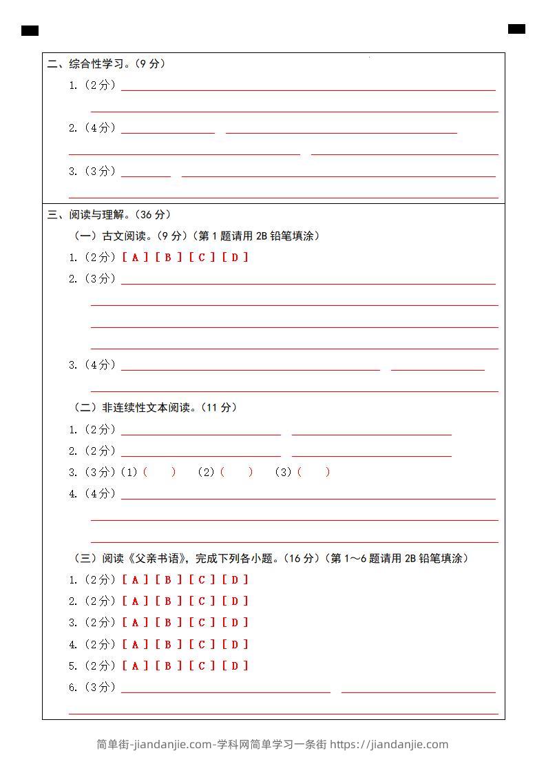 2024-2025学年第二学期五年级语文期末联考(二)答题卡【五下】 简单街 7月前发布 关注 私信 080 2024-2025学年第二学期五年级语文期末联考(二)答题卡【五下】此内容为付费资源,请付费后查看¥2.7黄金会员免费钻石会员免费立即购买您当前未登录!建议登陆后购买,可保存购买订单格式pdf页数4 页大小99.47 KB付费资源 ——预览已结束,还剩2页未读——开通会员后可免费下载高清完整文档 © 版权声明文章版权归作者所有,未经允许请勿转载。THE END小学语文喜欢就支持一下吧点赞0 分享收藏0