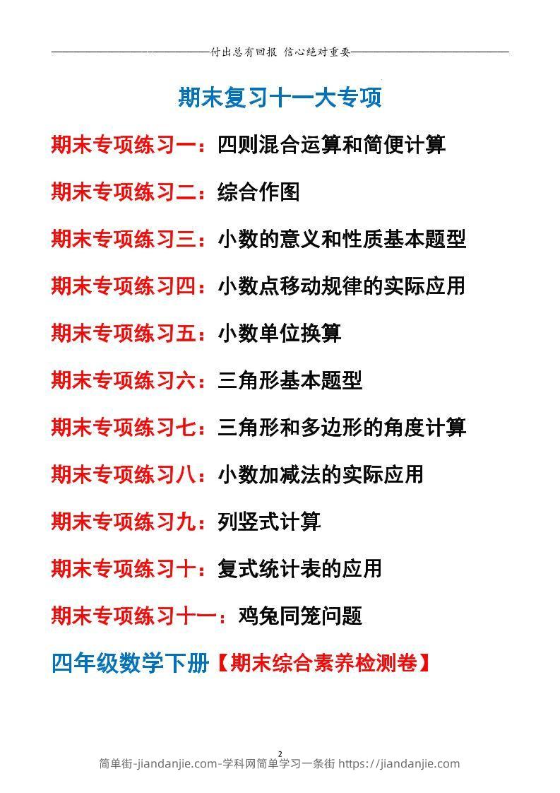 四下数学期末专项复习(人教版11大专项) 简单街 10月前发布 关注 私信 010 四下数学期末专项复习(人教版11大专项)此内容为付费资源,请付费后查看¥0.9黄金会员免费钻石会员免费立即购买您当前未登录!建议登陆后购买,可保存购买订单格式pdf页数48 页大小2.06 MB付费资源 ——预览已结束,还剩46页未读——开通会员后可免费下载高清完整文档 © 版权声明文章版权归作者所有,未经允许请勿转载。THE END小学数学喜欢就支持一下吧点赞0 分享收藏0