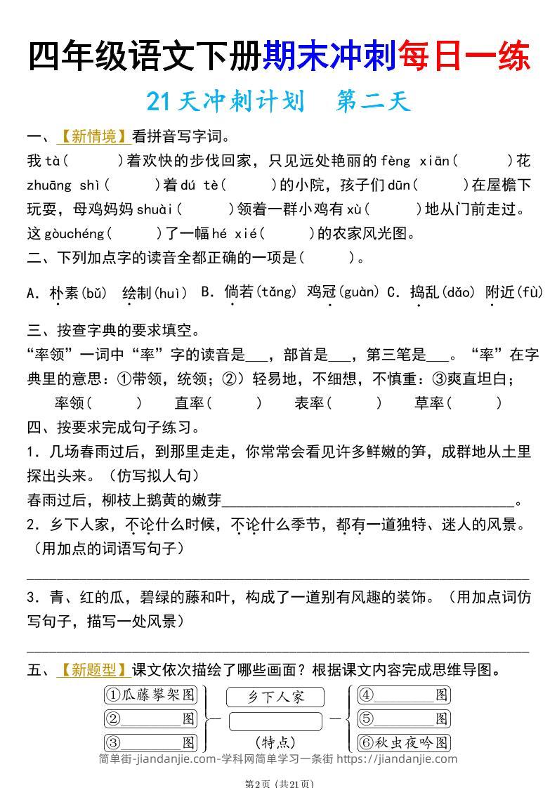四年级下册语文期末总复习21天冲刺计划(附答案) 简单街 9月前发布 关注 私信 020 四年级下册语文期末总复习21天冲刺计划(附答案)此内容为付费资源,请付费后查看¥1.5黄金会员免费钻石会员免费立即购买您当前未登录!建议登陆后购买,可保存购买订单格式pdf页数28 页大小1.91 MB付费资源 ——预览已结束,还剩26页未读——开通会员后可免费下载高清完整文档 © 版权声明文章版权归作者所有,未经允许请勿转载。THE END小学语文喜欢就支持一下吧点赞0 分享收藏0