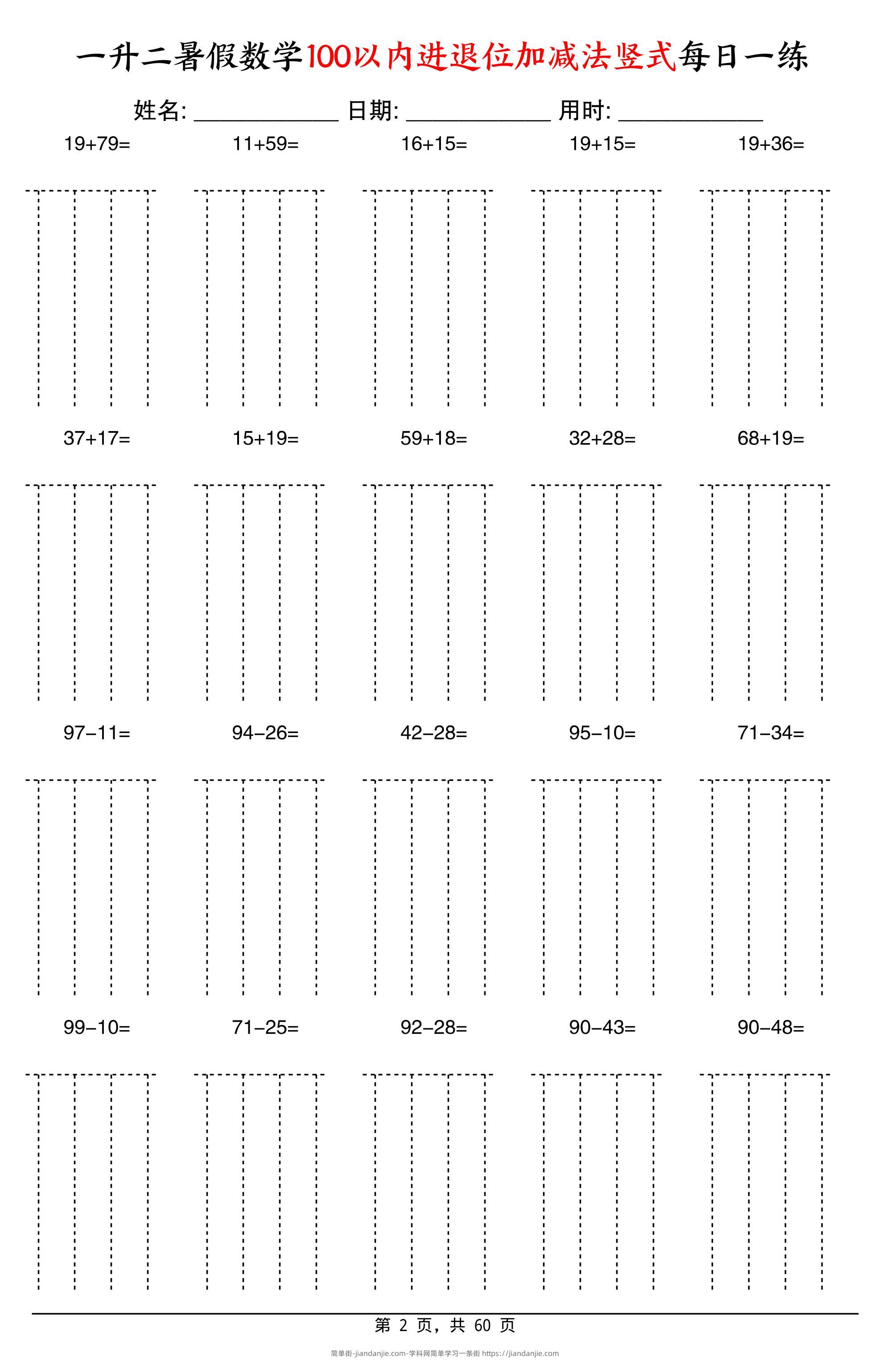 一升二暑假数学100以内进退位加减法竖式每日一练60天-二上数学 简单街 4月前发布 关注 私信 010 一升二暑假数学100以内进退位加减法竖式每日一练60天-二上数学此内容为付费资源,请付费后查看¥1.5黄金会员免费钻石会员免费立即购买您当前未登录!建议登陆后购买,可保存购买订单格式pdf页数60 页大小2.34 MB付费资源 ——预览已结束,还剩58页未读——开通会员后可免费下载高清完整文档 © 版权声明文章版权归作者所有,未经允许请勿转载。THE END小学数学喜欢就支持一下吧点赞0 分享收藏0