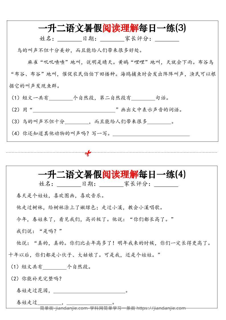 一升二语文暑假阅读理解每日一练32天(16页)-二上语文 简单街 4月前发布 关注 私信 040 一升二语文暑假阅读理解每日一练32天(16页)-二上语文此内容为付费资源,请付费后查看¥2.7黄金会员免费钻石会员免费立即购买您当前未登录!建议登陆后购买,可保存购买订单格式pdf页数16 页大小1.29 MB付费资源 ——预览已结束,还剩14页未读——开通会员后可免费下载高清完整文档 © 版权声明文章版权归作者所有,未经允许请勿转载。THE END小学语文喜欢就支持一下吧点赞0 分享收藏0