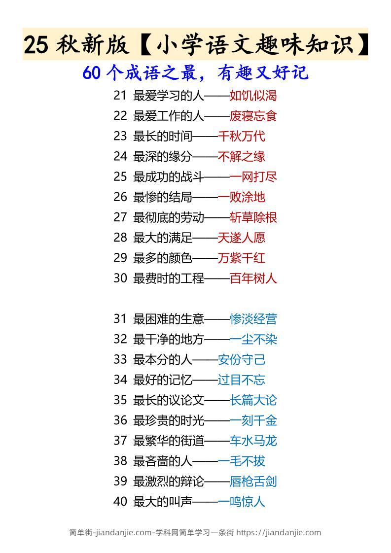 【2025秋新版】【小学语文趣味知识】60个成语之最,有趣又好记-六上语文 简单街 9月前发布 关注 私信 0330 【2025秋新版】【小学语文趣味知识】60个成语之最,有趣又好记-六上语文此内容为付费资源,请付费后查看¥2.7黄金会员免费钻石会员免费立即购买您当前未登录!建议登陆后购买,可保存购买订单格式pdf页数3 页大小151.75 KB付费资源 ——预览已结束,还剩1页未读——开通会员后可免费下载高清完整文档 © 版权声明文章版权归作者所有,未经允许请勿转载。THE END小学语文喜欢就支持一下吧点赞0 分享收藏0