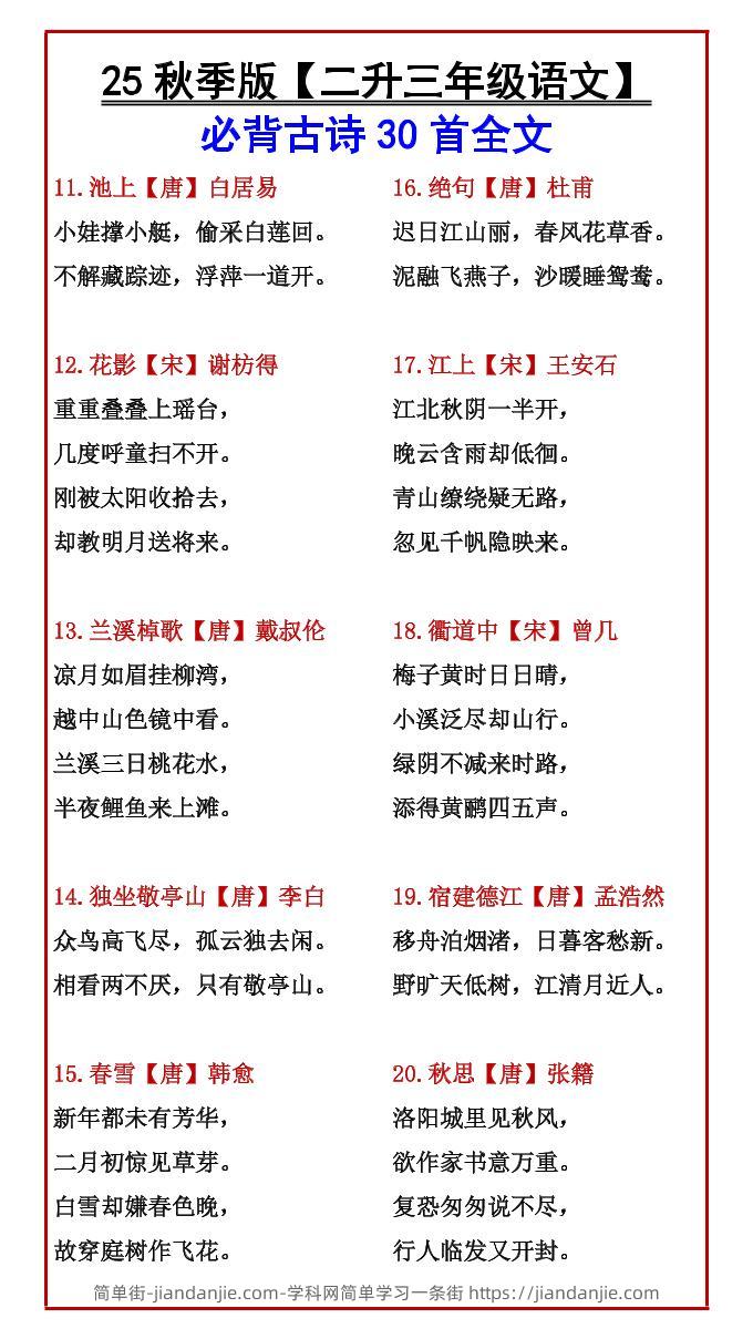 【2025秋新版】【二升三年级语文】必背古诗30首全文-三上语文 简单街 8月前发布 关注 私信 010 【2025秋新版】【二升三年级语文】必背古诗30首全文-三上语文此内容为付费资源,请付费后查看¥2.7黄金会员免费钻石会员免费立即购买您当前未登录!建议登陆后购买,可保存购买订单格式pdf页数6 页大小164.64 KB付费资源 ——预览已结束,还剩4页未读——开通会员后可免费下载高清完整文档 © 版权声明文章版权归作者所有,未经允许请勿转载。THE END小学语文喜欢就支持一下吧点赞0 分享收藏0