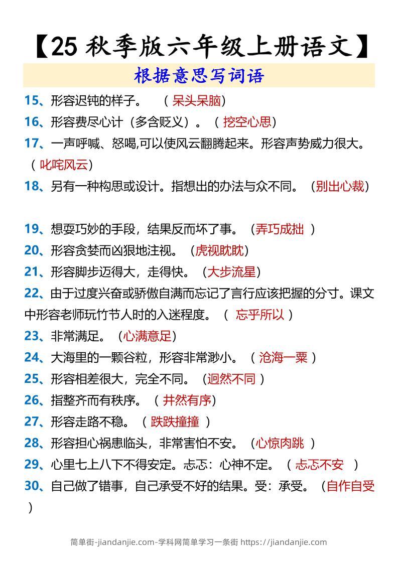 【2025秋新版】【六年级上册语文】根据意思写词语 简单街 6月前发布 关注 私信 0290 【2025秋新版】【六年级上册语文】根据意思写词语此内容为付费资源,请付费后查看¥1.2黄金会员免费钻石会员免费立即购买您当前未登录!建议登陆后购买,可保存购买订单格式pdf页数4 页大小225.20 KB付费资源 ——预览已结束,还剩2页未读——开通会员后可免费下载高清完整文档 © 版权声明文章版权归作者所有,未经允许请勿转载。THE END小学语文喜欢就支持一下吧点赞0 分享收藏0