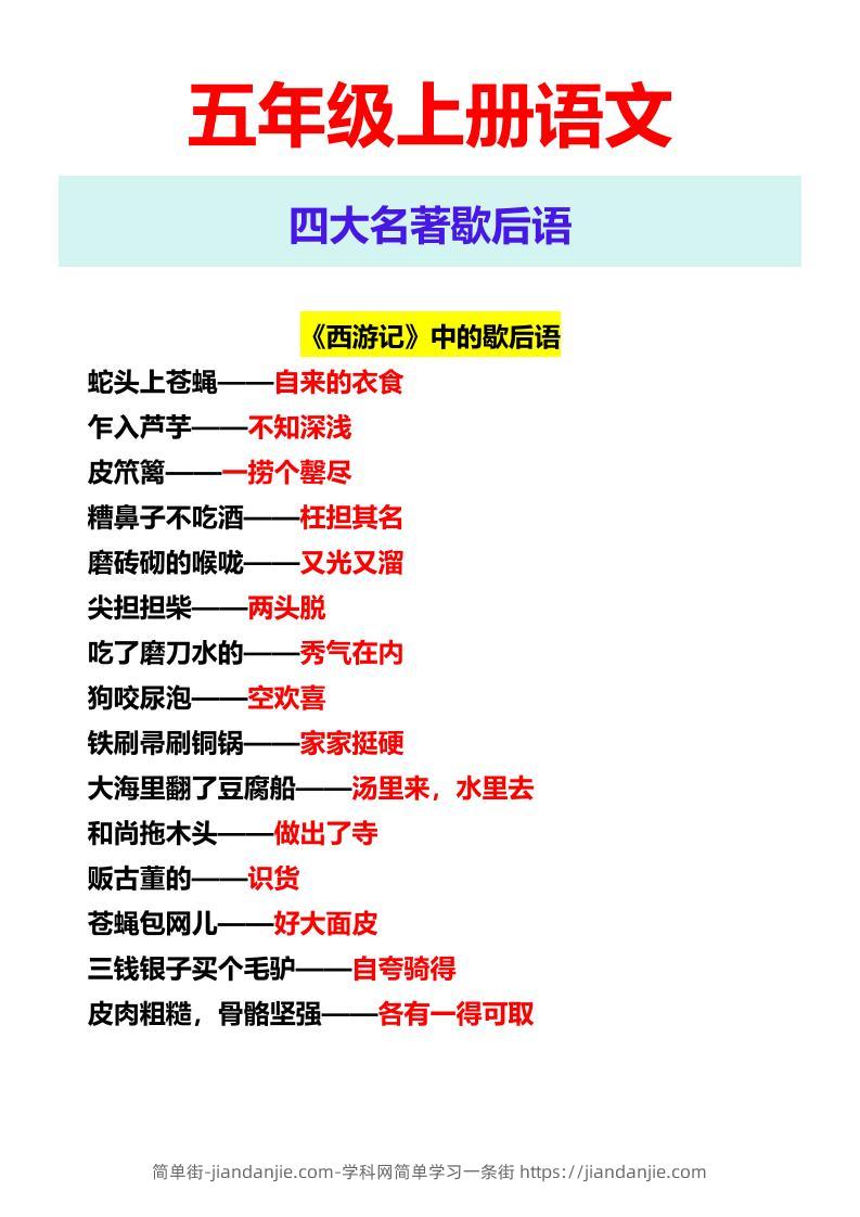 【2025秋新版】五年级上册语文四大名著歇后语 简单街 9月前发布 关注 私信 020 【2025秋新版】五年级上册语文四大名著歇后语此内容为付费资源,请付费后查看¥0.9黄金会员免费钻石会员免费立即购买您当前未登录!建议登陆后购买,可保存购买订单格式pdf页数5 页大小167.01 KB付费资源 ——预览已结束,还剩3页未读——开通会员后可免费下载高清完整文档 © 版权声明文章版权归作者所有,未经允许请勿转载。THE END小学语文喜欢就支持一下吧点赞0 分享收藏0