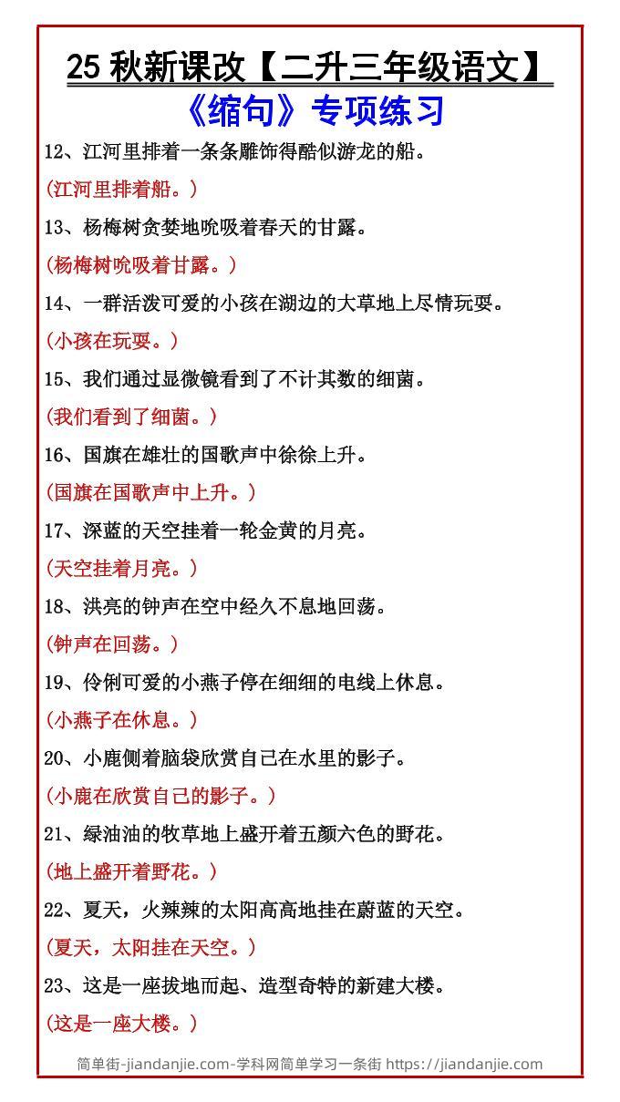 【2025秋新版】【二升三年级语文】《缩句》专项练习-三上语文 简单街 6月前发布 关注 私信 080 【2025秋新版】【二升三年级语文】《缩句》专项练习-三上语文此内容为付费资源,请付费后查看¥1.5黄金会员免费钻石会员免费立即购买您当前未登录!建议登陆后购买,可保存购买订单格式pdf页数4 页大小99.19 KB付费资源 ——预览已结束,还剩2页未读——开通会员后可免费下载高清完整文档 © 版权声明文章版权归作者所有,未经允许请勿转载。THE END小学语文喜欢就支持一下吧点赞0 分享收藏0