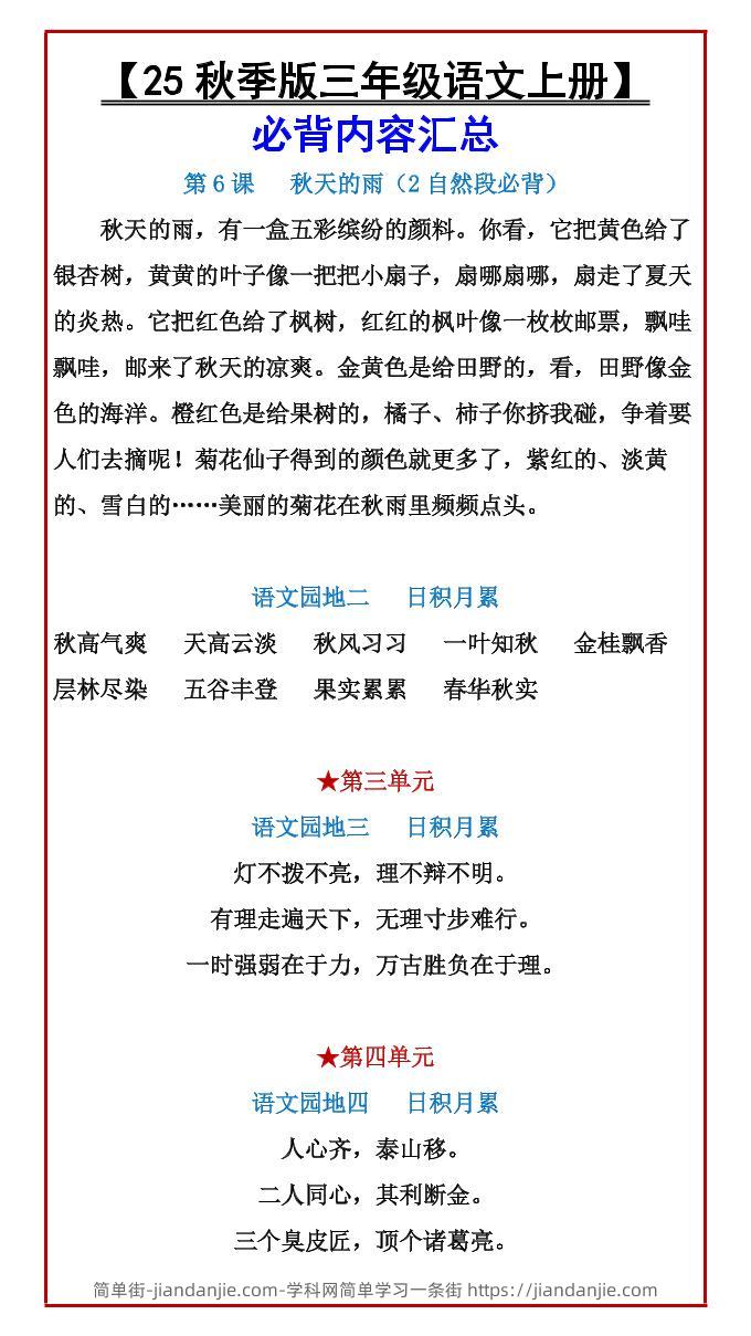 【2025秋新版】【三年级语文上册】必背内容汇总 简单街 4月前发布 关注 私信 0260 【2025秋新版】【三年级语文上册】必背内容汇总此内容为付费资源,请付费后查看¥2.7黄金会员免费钻石会员免费立即购买您当前未登录!建议登陆后购买,可保存购买订单格式pdf页数5 页大小123.02 KB付费资源 ——预览已结束,还剩3页未读——开通会员后可免费下载高清完整文档 © 版权声明文章版权归作者所有,未经允许请勿转载。THE END小学语文喜欢就支持一下吧点赞0 分享收藏0