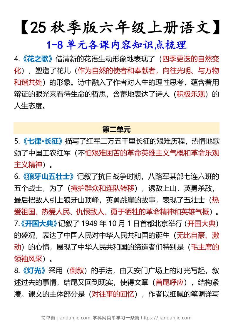 【2025秋新版】【六年级上册语文】1-8单元各课内容知识点梳理 简单街 4月前发布 关注 私信 0120 【2025秋新版】【六年级上册语文】1-8单元各课内容知识点梳理此内容为付费资源,请付费后查看¥0.9黄金会员免费钻石会员免费立即购买您当前未登录!建议登陆后购买,可保存购买订单格式pdf页数7 页大小403.60 KB付费资源 ——预览已结束,还剩5页未读——开通会员后可免费下载高清完整文档 © 版权声明文章版权归作者所有,未经允许请勿转载。THE END小学语文喜欢就支持一下吧点赞0 分享收藏0