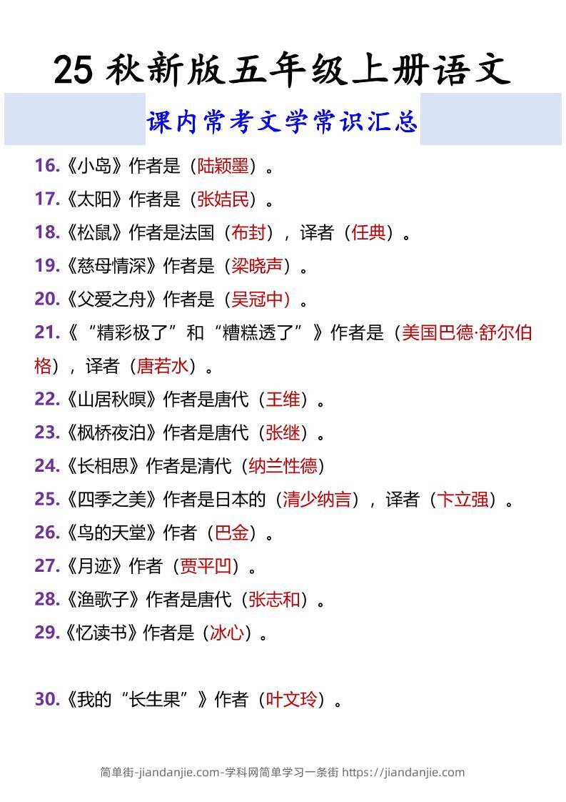 【2025秋新版】五年级上册语文课内常考文学常识汇总 简单街 6月前发布 关注 私信 030 【2025秋新版】五年级上册语文课内常考文学常识汇总此内容为付费资源,请付费后查看¥1.5黄金会员免费钻石会员免费立即购买您当前未登录!建议登陆后购买,可保存购买订单格式pdf页数3 页大小128.61 KB付费资源 ——预览已结束,还剩1页未读——开通会员后可免费下载高清完整文档 © 版权声明文章版权归作者所有,未经允许请勿转载。THE END小学语文喜欢就支持一下吧点赞0 分享收藏0