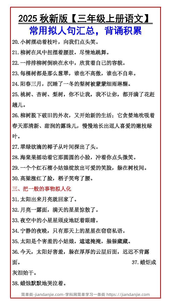 【2025秋新版】【三年级上册语文】常用拟人句汇总,背诵积累 简单街 6月前发布 关注 私信 0340 【2025秋新版】【三年级上册语文】常用拟人句汇总,背诵积累此内容为付费资源,请付费后查看¥1.5黄金会员免费钻石会员免费立即购买您当前未登录!建议登陆后购买,可保存购买订单格式pdf页数3 页大小111.93 KB付费资源 ——预览已结束,还剩1页未读——开通会员后可免费下载高清完整文档 © 版权声明文章版权归作者所有,未经允许请勿转载。THE END小学语文喜欢就支持一下吧点赞0 分享收藏0