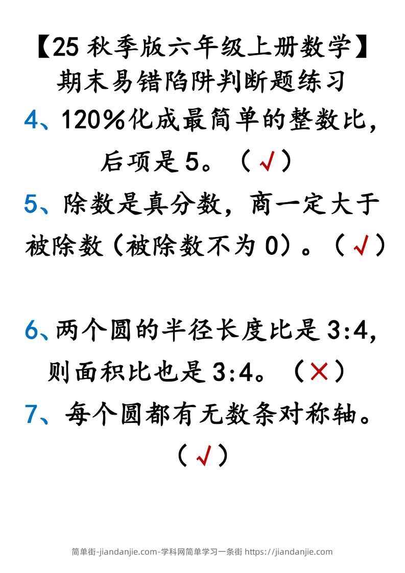 【2025秋新版】【六年级上册数学】期末易错陷阱判断题练习 简单街 7月前发布 关注 私信 0260 【2025秋新版】【六年级上册数学】期末易错陷阱判断题练习此内容为付费资源,请付费后查看¥1.5黄金会员免费钻石会员免费立即购买您当前未登录!建议登陆后购买,可保存购买订单格式pdf页数10 页大小79.66 KB付费资源 ——预览已结束,还剩8页未读——开通会员后可免费下载高清完整文档 © 版权声明文章版权归作者所有,未经允许请勿转载。THE END小学数学喜欢就支持一下吧点赞0 分享收藏0