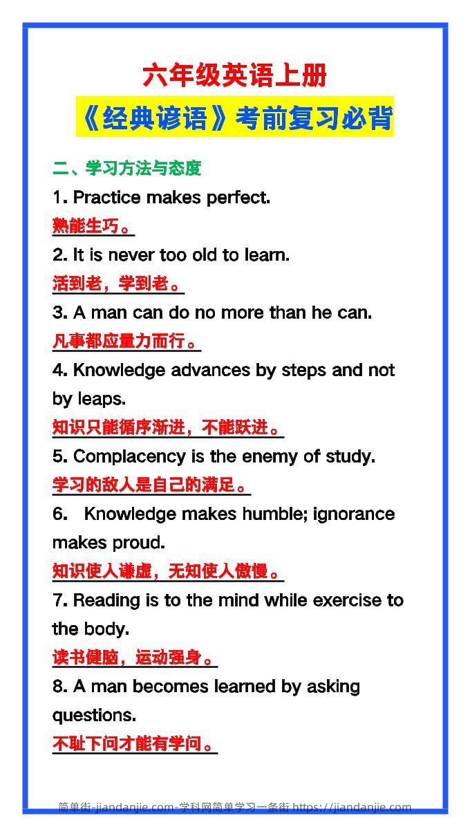 【2025秋新版】六年级英语上册《经典谚语》,考前必背! 简单街 3月前发布 关注 私信 020 【2025秋新版】六年级英语上册《经典谚语》,考前必背!此内容为付费资源,请付费后查看¥1.2黄金会员免费钻石会员免费立即购买您当前未登录!建议登陆后购买,可保存购买订单格式pdf页数6 页大小90.69 KB付费资源 ——预览已结束,还剩4页未读——开通会员后可免费下载高清完整文档 © 版权声明文章版权归作者所有,未经允许请勿转载。THE END小学英语喜欢就支持一下吧点赞0 分享收藏0