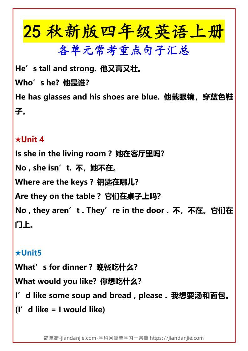 【2025秋新版】四年级英语上册各单元常考重点句子汇总 简单街 3月前发布 关注 私信 050 【2025秋新版】四年级英语上册各单元常考重点句子汇总此内容为付费资源,请付费后查看¥0.9黄金会员免费钻石会员免费立即购买您当前未登录!建议登陆后购买,可保存购买订单格式pdf页数5 页大小95.95 KB付费资源 ——预览已结束,还剩3页未读——开通会员后可免费下载高清完整文档 © 版权声明文章版权归作者所有,未经允许请勿转载。THE END小学英语喜欢就支持一下吧点赞0 分享收藏0