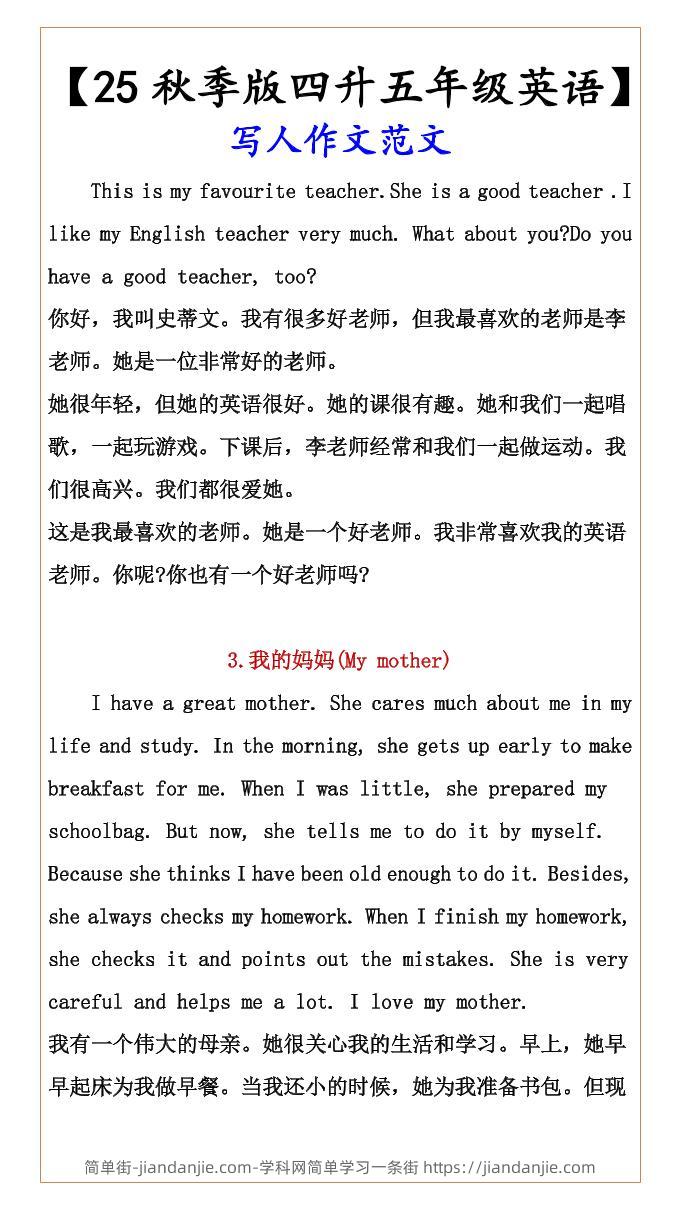 【2025秋新版】【四升五年级英语】写人作文范文-五上英语 简单街 3月前发布 关注 私信 010 【2025秋新版】【四升五年级英语】写人作文范文-五上英语此内容为付费资源,请付费后查看¥2.7黄金会员免费钻石会员免费立即购买您当前未登录!建议登陆后购买,可保存购买订单格式pdf页数3 页大小69.44 KB付费资源 ——预览已结束,还剩1页未读——开通会员后可免费下载高清完整文档 © 版权声明文章版权归作者所有,未经允许请勿转载。THE END小学英语喜欢就支持一下吧点赞0 分享收藏0