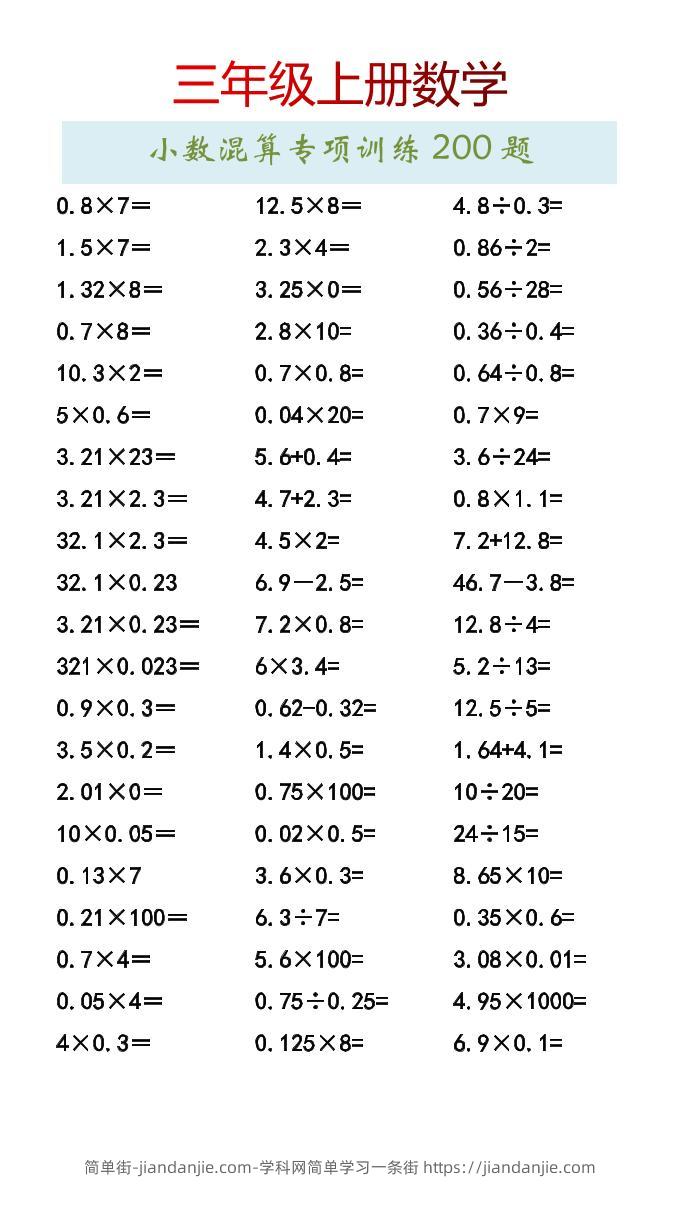 【2025秋新版】三年级上册数学小数混算专项训练200题 简单街 6月前发布 关注 私信 0210 【2025秋新版】三年级上册数学小数混算专项训练200题此内容为付费资源,请付费后查看¥1.5黄金会员免费钻石会员免费立即购买您当前未登录!建议登陆后购买,可保存购买订单格式pdf页数4 页大小74.27 KB付费资源 ——预览已结束,还剩2页未读——开通会员后可免费下载高清完整文档 © 版权声明文章版权归作者所有,未经允许请勿转载。THE END小学数学喜欢就支持一下吧点赞0 分享收藏0