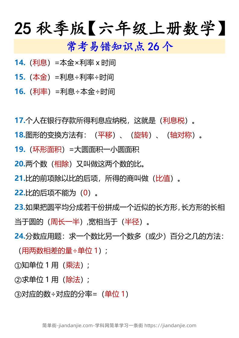 【2025秋新版】【六年级上册数学】常考易错知识点26个 简单街 5月前发布 关注 私信 0260 【2025秋新版】【六年级上册数学】常考易错知识点26个此内容为付费资源,请付费后查看¥1.5黄金会员免费钻石会员免费立即购买您当前未登录!建议登陆后购买,可保存购买订单格式pdf页数3 页大小96.75 KB付费资源 ——预览已结束,还剩1页未读——开通会员后可免费下载高清完整文档 © 版权声明文章版权归作者所有,未经允许请勿转载。THE END小学数学喜欢就支持一下吧点赞0 分享收藏0