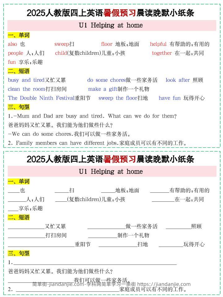 25新人教PEP四上英语暑假预习晨读晚默小纸条11天(11页) 简单街 3月前发布 关注 私信 000 25新人教PEP四上英语暑假预习晨读晚默小纸条11天(11页)此内容为付费资源,请付费后查看¥1.5黄金会员免费钻石会员免费立即购买您当前未登录!建议登陆后购买,可保存购买订单格式pdf页数11 页大小240.36 KB付费资源 ——预览已结束,还剩9页未读——开通会员后可免费下载高清完整文档 © 版权声明文章版权归作者所有,未经允许请勿转载。THE END小学英语喜欢就支持一下吧点赞0 分享收藏0