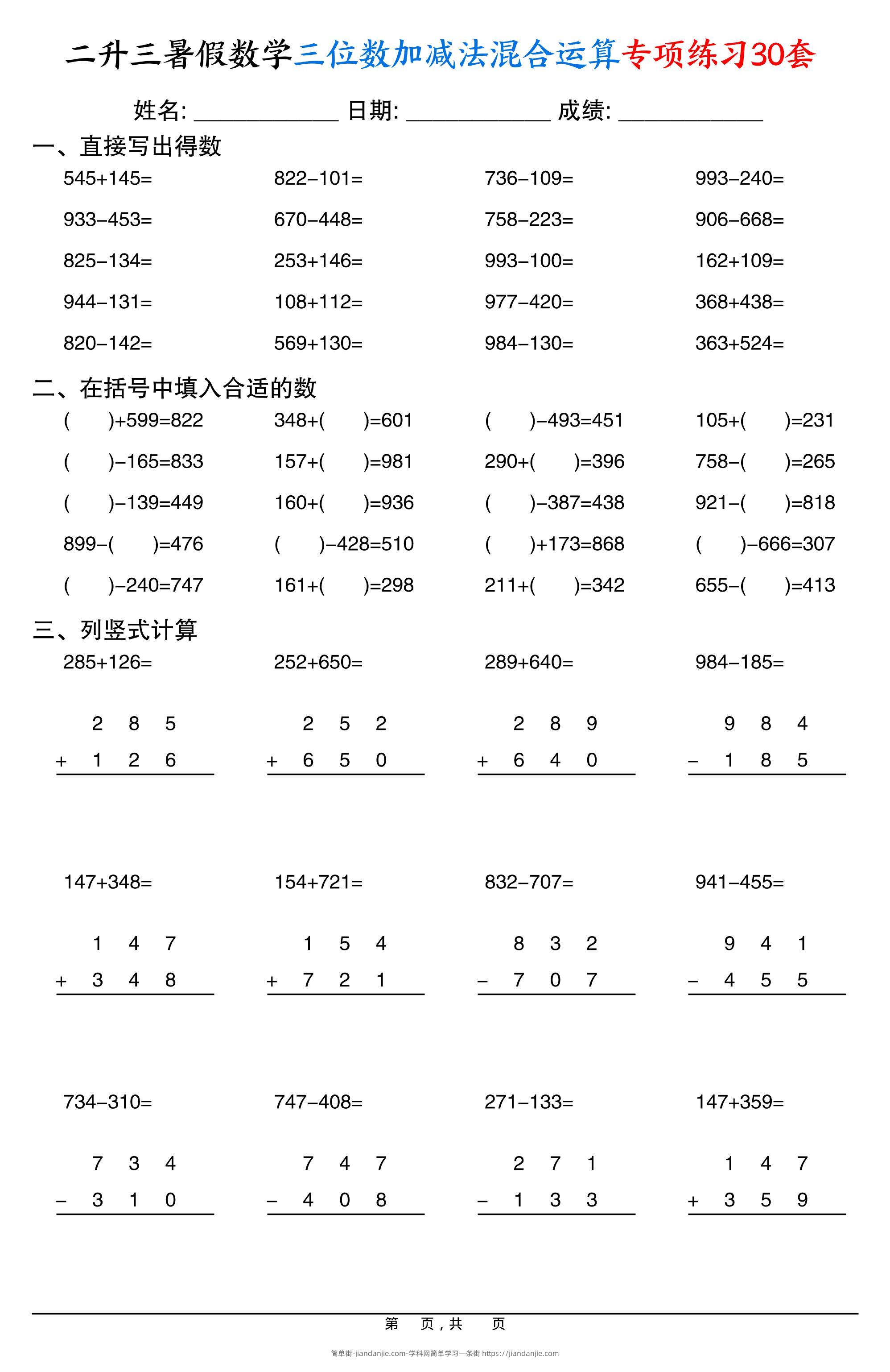二升三暑假数学三位数加减法混合运算专项练习30套30页-三上数学 简单街 5月前发布 关注 私信 030 二升三暑假数学三位数加减法混合运算专项练习30套30页-三上数学此内容为付费资源,请付费后查看¥0.9黄金会员免费钻石会员免费立即购买您当前未登录!建议登陆后购买,可保存购买订单格式pdf页数30 页大小140.73 KB付费资源 ——预览已结束,还剩28页未读——开通会员后可免费下载高清完整文档 © 版权声明文章版权归作者所有,未经允许请勿转载。THE END小学数学喜欢就支持一下吧点赞0 分享收藏0