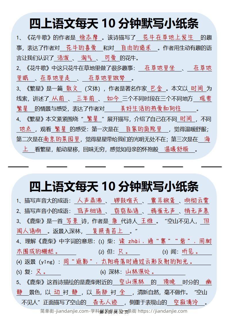 四上丨语文每天10分钟默写小纸条 简单街 6月前发布 关注 私信 050 四上丨语文每天10分钟默写小纸条此内容为付费资源,请付费后查看¥2.7黄金会员免费钻石会员免费立即购买您当前未登录!建议登陆后购买,可保存购买订单格式pdf页数32 页大小2.85 MB付费资源 ——预览已结束,还剩30页未读——开通会员后可免费下载高清完整文档 © 版权声明文章版权归作者所有,未经允许请勿转载。THE END小学语文喜欢就支持一下吧点赞0 分享收藏0
