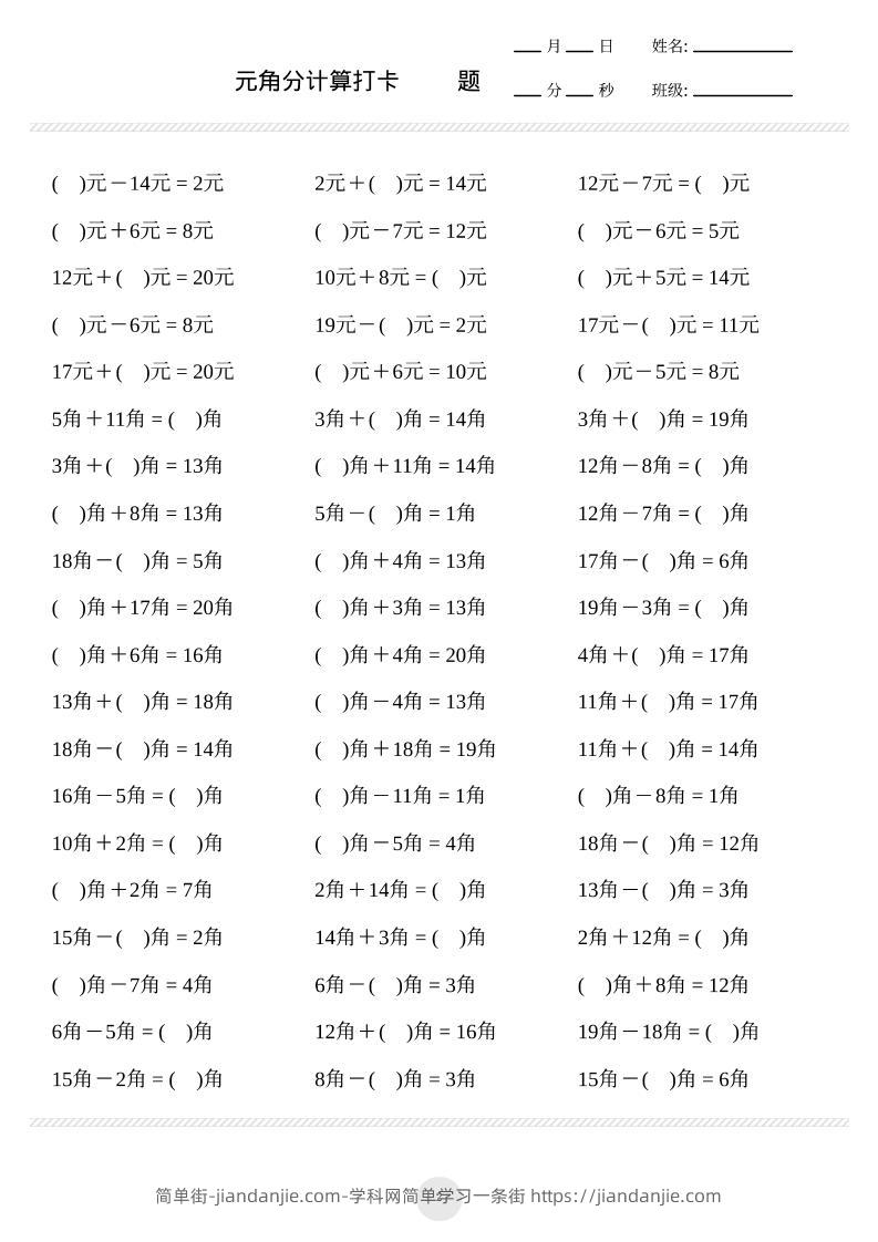 一上数学元角分计算专项练习1000题 简单街 7月前发布 关注 私信 030 一上数学元角分计算专项练习1000题此内容为付费资源,请付费后查看¥1.5黄金会员免费钻石会员免费立即购买您当前未登录!建议登陆后购买,可保存购买订单格式pdf页数17 页大小1.69 MB付费资源 ——预览已结束,还剩15页未读——开通会员后可免费下载高清完整文档 © 版权声明文章版权归作者所有,未经允许请勿转载。THE END小学数学喜欢就支持一下吧点赞0 分享收藏0