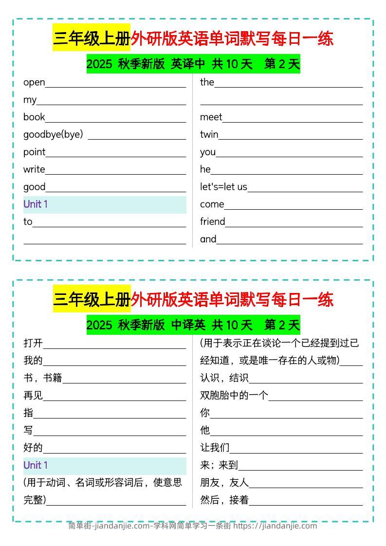 三年级上册外研版英语单词默写每日一练 简单街 2月前发布 关注 私信 0410 三年级上册外研版英语单词默写每日一练此内容为付费资源,请付费后查看¥2.7黄金会员免费钻石会员免费立即购买您当前未登录!建议登陆后购买,可保存购买订单格式pdf页数10 页大小248.56 KB付费资源 ——预览已结束,还剩8页未读——开通会员后可免费下载高清完整文档 © 版权声明文章版权归作者所有,未经允许请勿转载。THE END小学英语喜欢就支持一下吧点赞0 分享收藏0